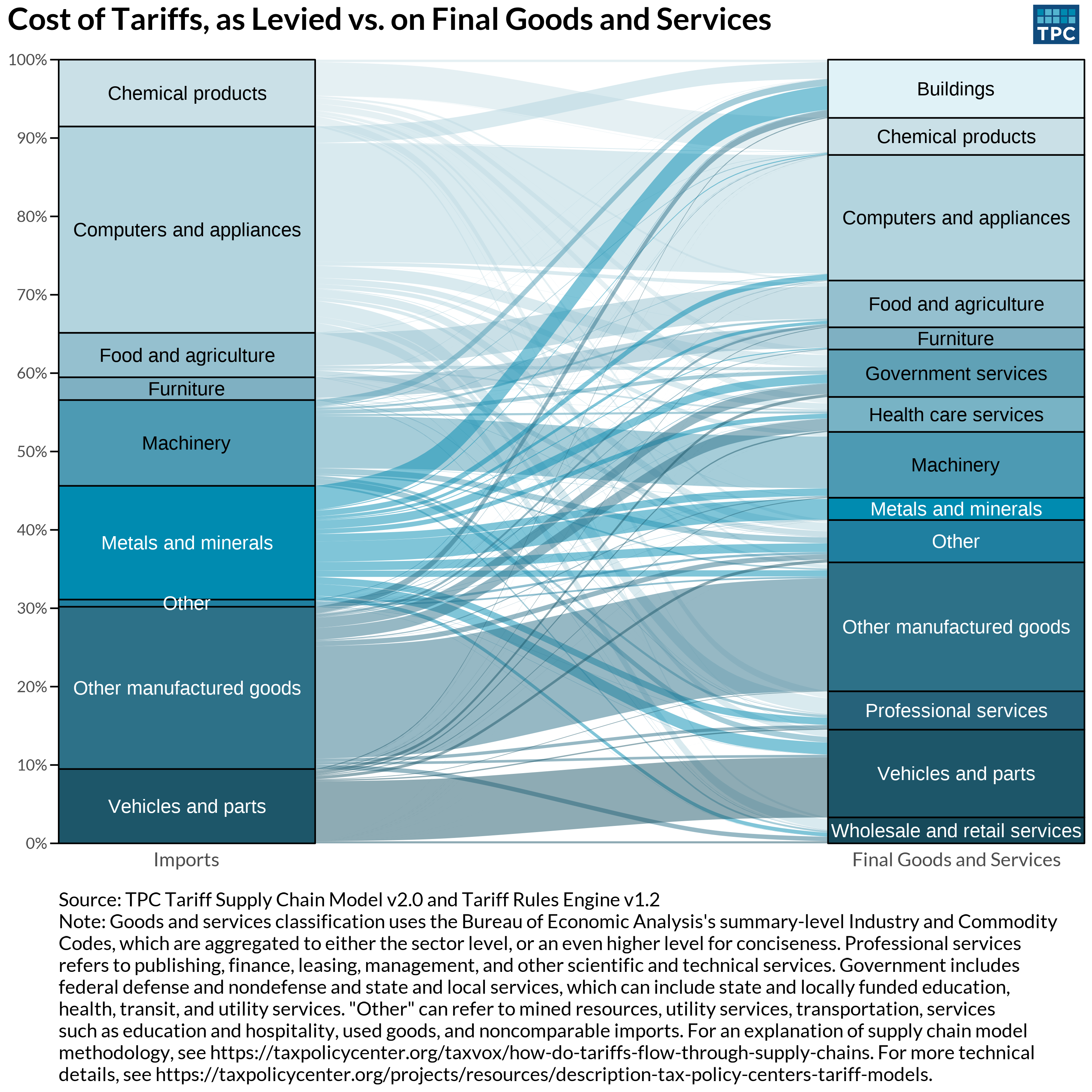 Tariffs on final goods are determined by tariffs on their intermediate inputs. We use input-output tables to map how goods feed into one another, and estimate final burden and price changes. Read more